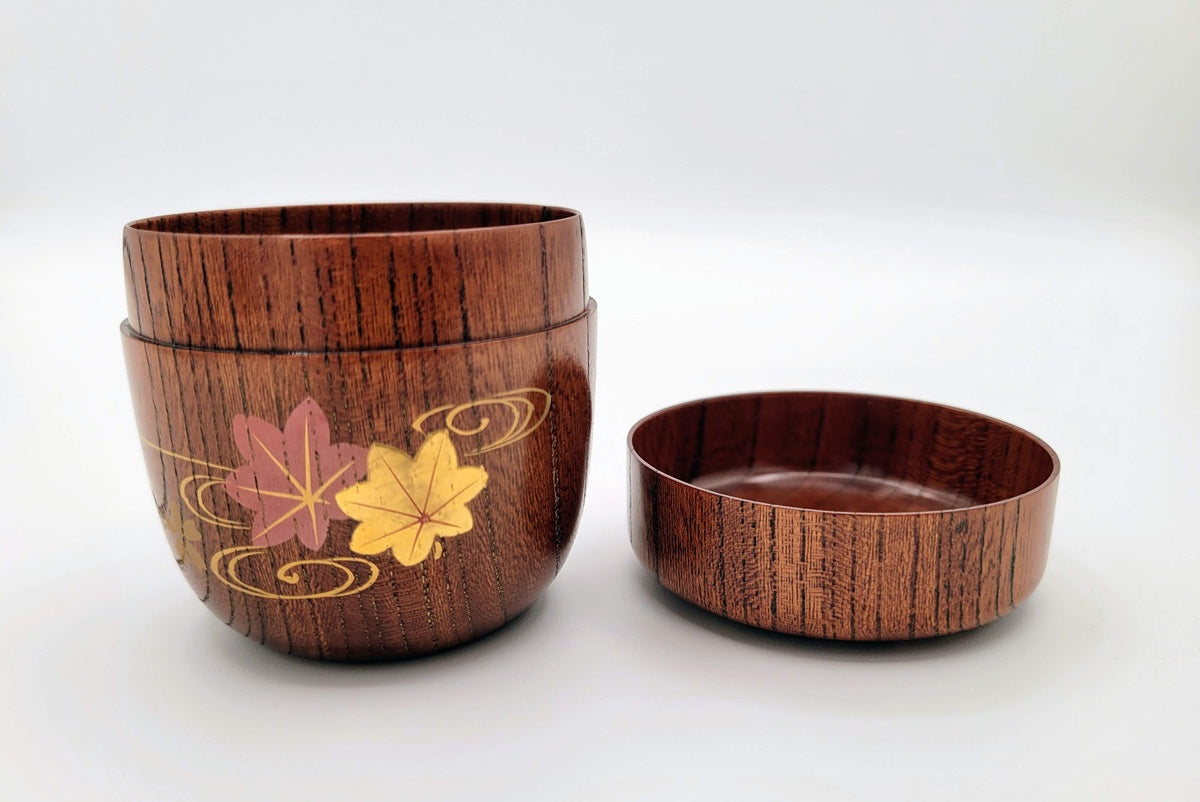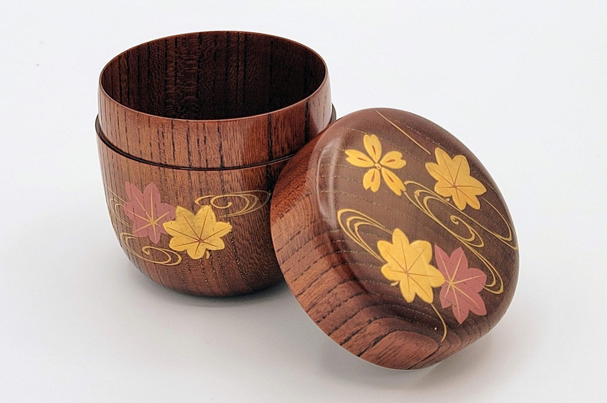 Het motief Tatsuta-gawa verwijst naar de rivier Tatsuta in Nara, een klassiek symbool van de Japanse herfst. In literatuur en kunst staat deze rivier voor vergankelijkheid (無常, mujō), vallende bladeren en het verstrijken van de seizoenen. De decoratie is uitgevoerd in maki-e: fijn poederwerk van goud en lak dat drijvende herfstbladeren afbeeldt op een stromende rivier. Deze poëtische voorstelling belichaamt de geest van wabi-sabi de schoonheid van eenvoud, stilte en tijd.