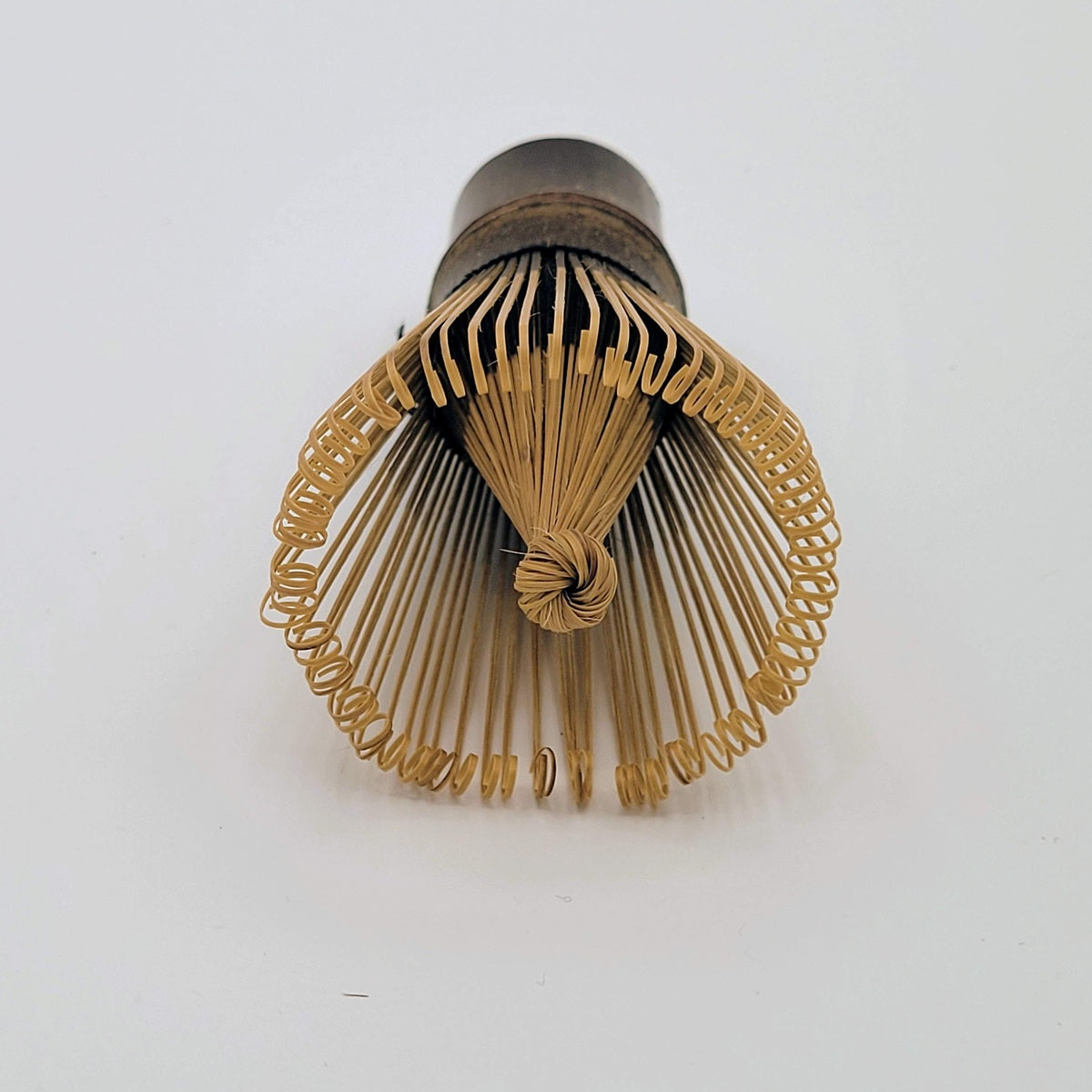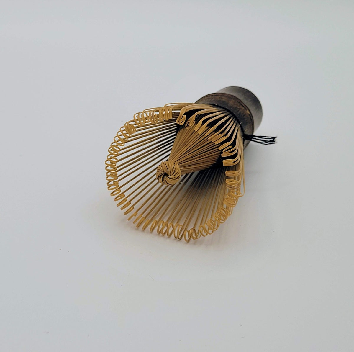 Deze chasen is vervaardigd uit donker bamboe (黒竹 kurotake), zorgvuldig met de hand gesneden en gevormd tot 100 fijne tanden (hyappon date), ideaal voor het luchtig, stabiel opschuimen van matcha. De donkere kleur ontstaat door een natuurlijke veroudering van de bamboe, soms versterkt door lichte roostering. Het resultaat is een borstel met een diepe, warme toon en een iets stevigere structuur, geliefd bij kenners die houden van verfijning en balans in hun theebereiding. Elke chasen wordt met de hand vervaardigd in Takayama (Nara), waar het traditionele Japanse chasenambacht al meer dan 500 jaar wordt doorgegeven.