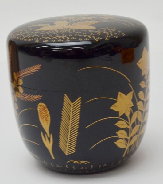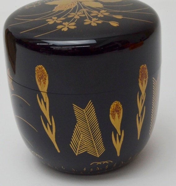 De natsume is uitgevoerd in diepzwarte urushi-lak, met een makie-decor van vier seizoensbloemen en grassen (Shiki sōka 四季草花蒔絵) in fijn goudpoeder. Elk detail weerspiegelt het Japanse begrip shun (de schoonheid van het moment), waarbij de seizoenen elkaar in subtiele vormen opvolgen. In de context van de theeceremonie (chanoyu) nodigt deze natsume uit tot bezinning, een moment op de drempel van tijd, waarin eenvoud en aandacht samenkomen. Het herinnert aan de vergankelijke pracht van elk seizoen, maar ook aan de continuïteit van het ritme van de natuur.