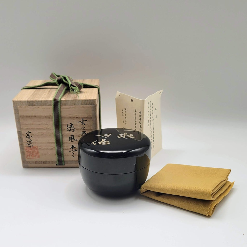 Deze elegante Tokufū Natsume (徳風棗) is gemaakt door Miyata Munekage 宮田宗景 na oorspronkelijk ontwerp van de 11e Urasenke-theemeester Gengen Saikō (玄々斎). Miyata is een hedendaagse Echizen urushi-kunstenaar, die studeerde onder Yōrin Issei (養輪一星).