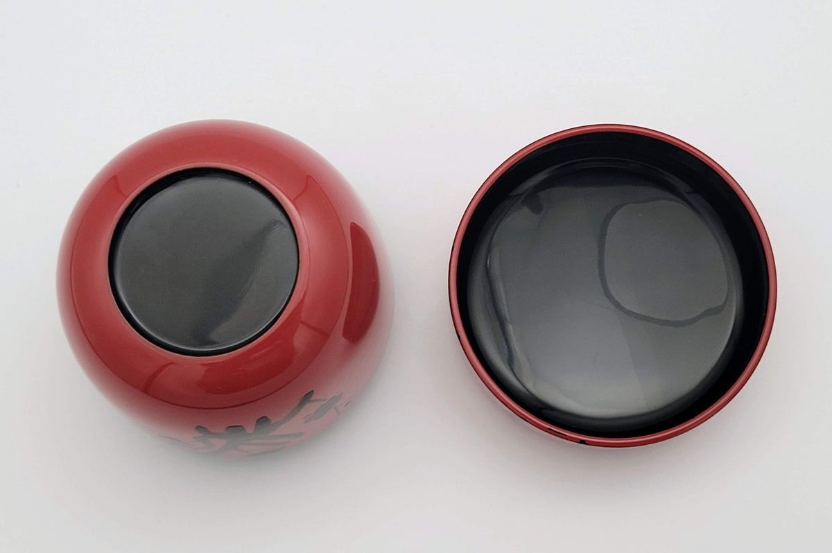 De rijke rode laklaag, verfraaid met subtiele zwarte takken en gouden accenten, weerspiegelt de harmonie tussen elegantie en kracht die kenmerkend is voor de Yamanaka-school. Deze verfijnde balans tussen traditie en moderne interpretatie maakt de natsume tot een uitzonderlijk voorbeeld van hedendaagse Japanse lakkunst.