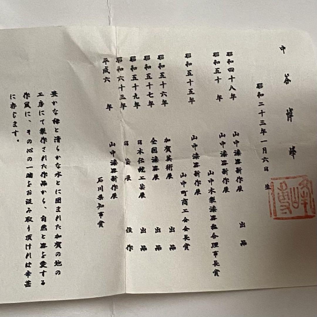 Het bijgevoegde biografische document beschrijft de professionele achtergrond van Nakaya Hakuhō, inclusief zijn deelname aan belangrijke tentoonstellingen zoals de Yamanaka Lacquerware Exhibition, de Japan Traditional Craft Exhibition en de Ishikawa Prefectural Art Awards. Hieruit blijkt zijn erkende positie binnen de Japanse ambachtelijke kunstwereld als vertegenwoordiger van de Yamanaka shikki (漆器)-traditie.