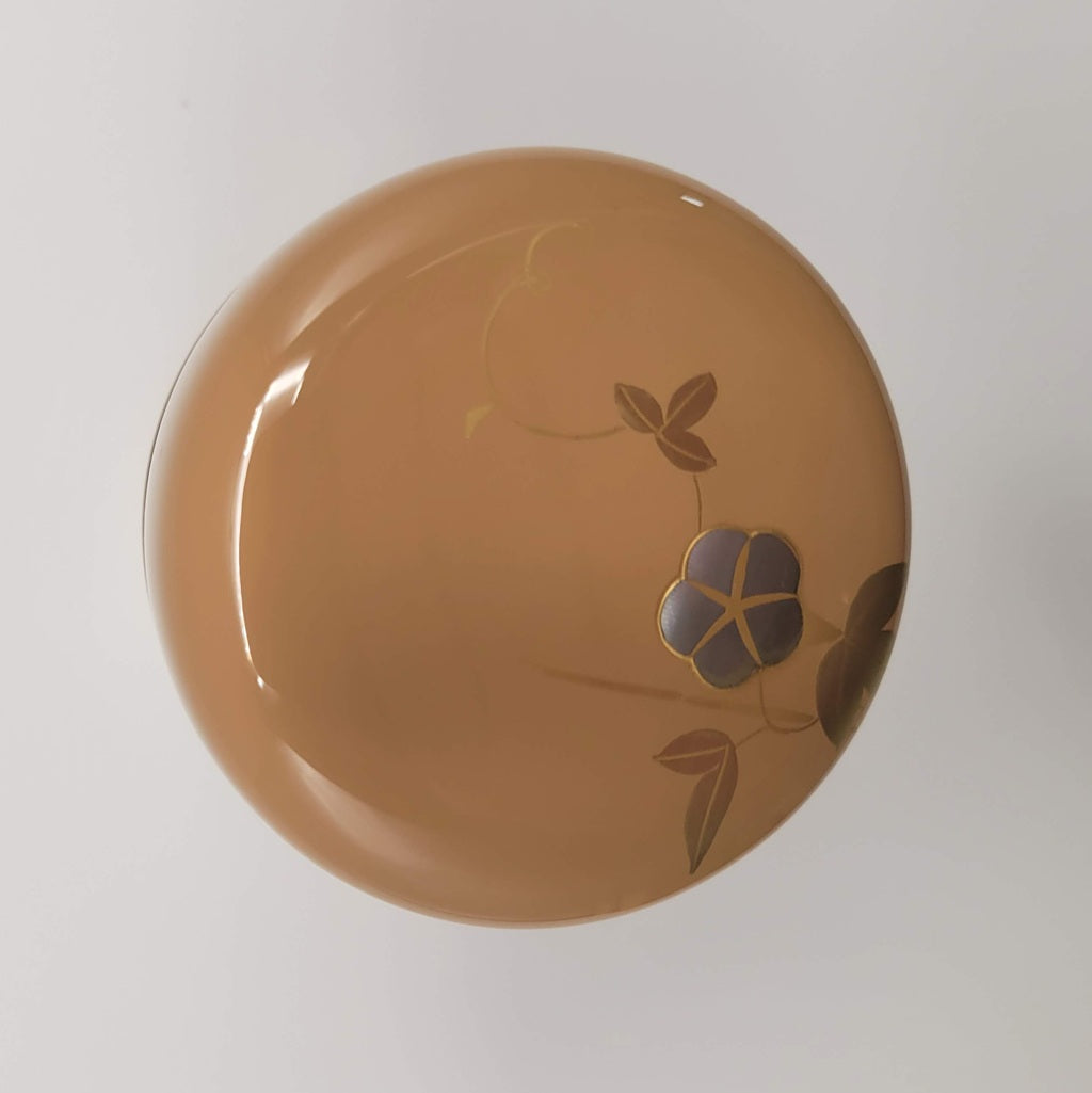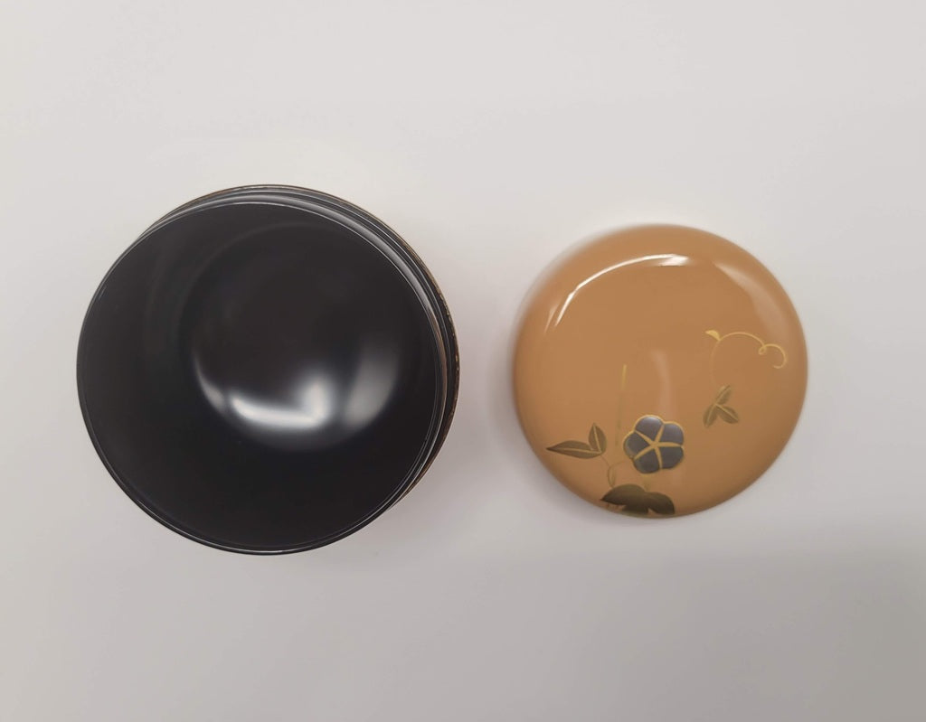 Deze verfijnde natsume is uitgevoerd in warm, honingkleurig urushi-lak en gedecoreerd met een asagao-motief (朝顔, morning glory) in delicate maki-e techniek. Het object ademt rust en ingetogen elegantie, kwaliteiten die binnen de Japanse theeceremonie essentieel zijn.